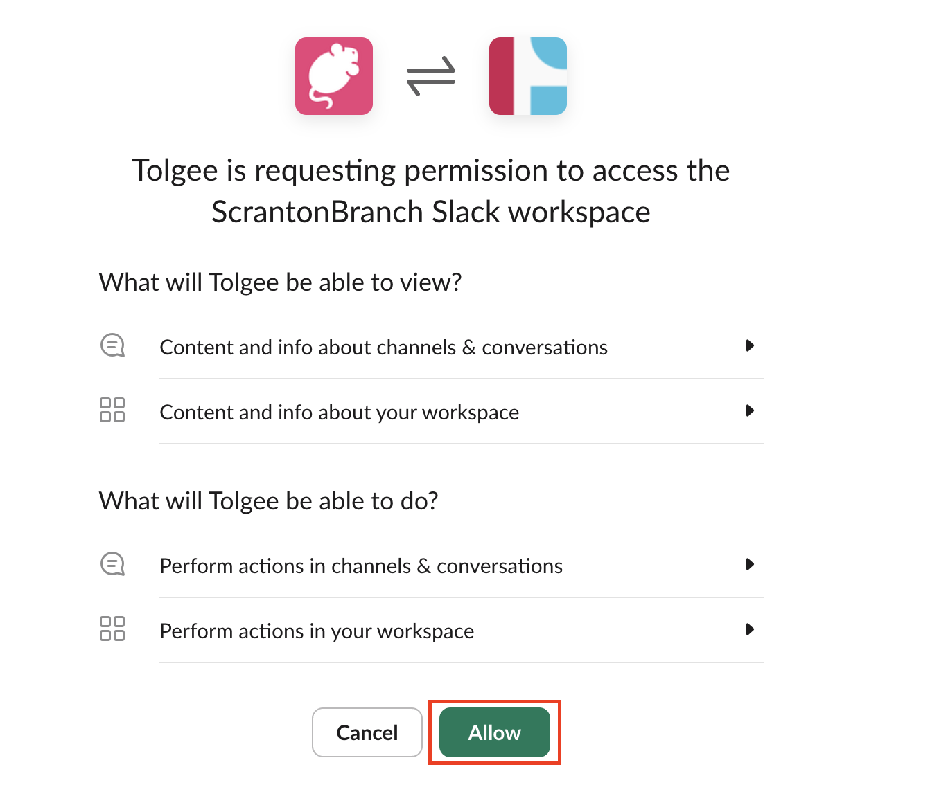 After that follow the prompts to authorize Tolgee app to access your Slack workspace just by clicking Allow