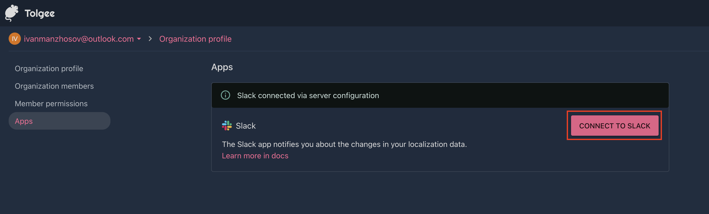 Step 2: Connect your Slack account with your Tolgee account
